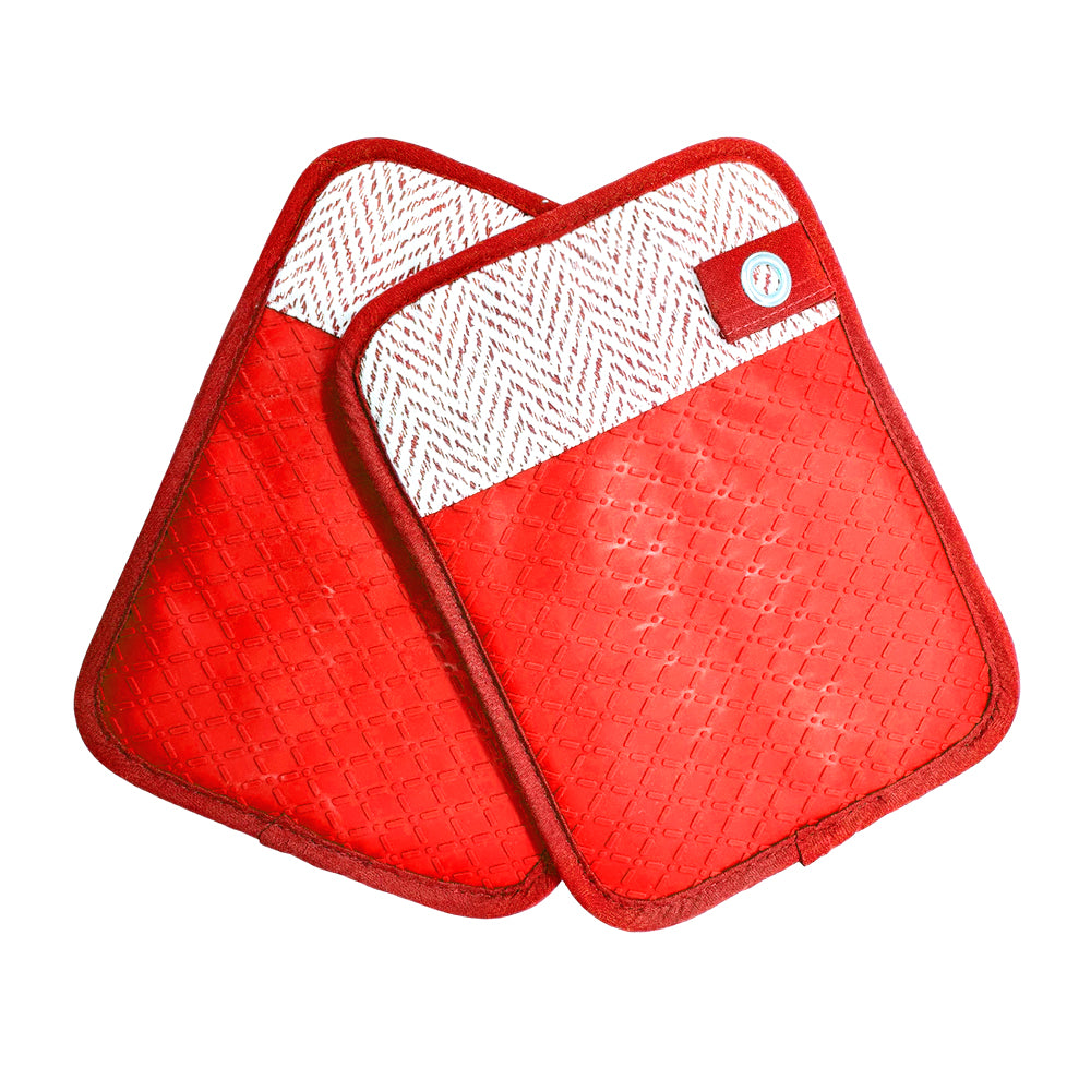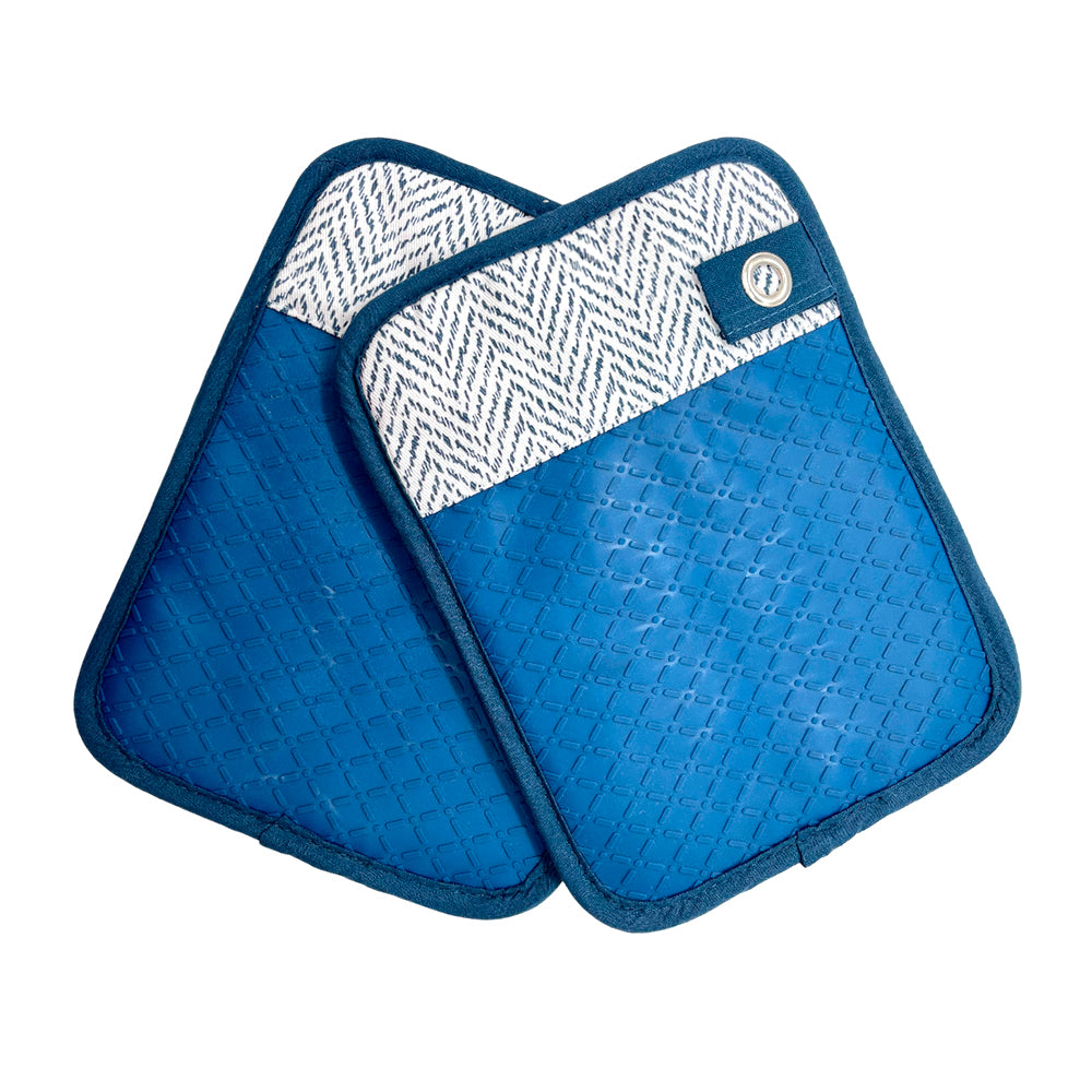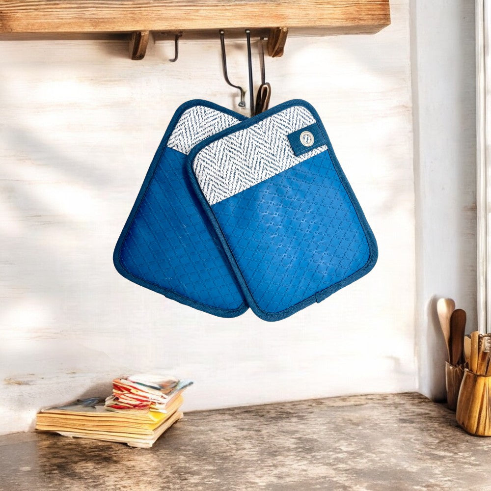 Fabricados con 100% algodón y una resistente empuñadura de silicona, ofrecen una excelente barrera térmica para manipular ollas, sartenes y bandejas calientes con total confianza. Su bolsillo ergonómico permite introducir la mano de forma segura y cómoda, garantizando un agarre firme mientras cocinas.