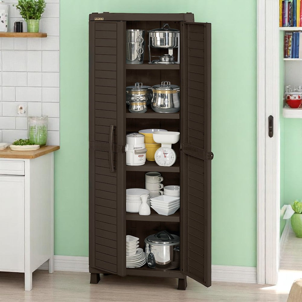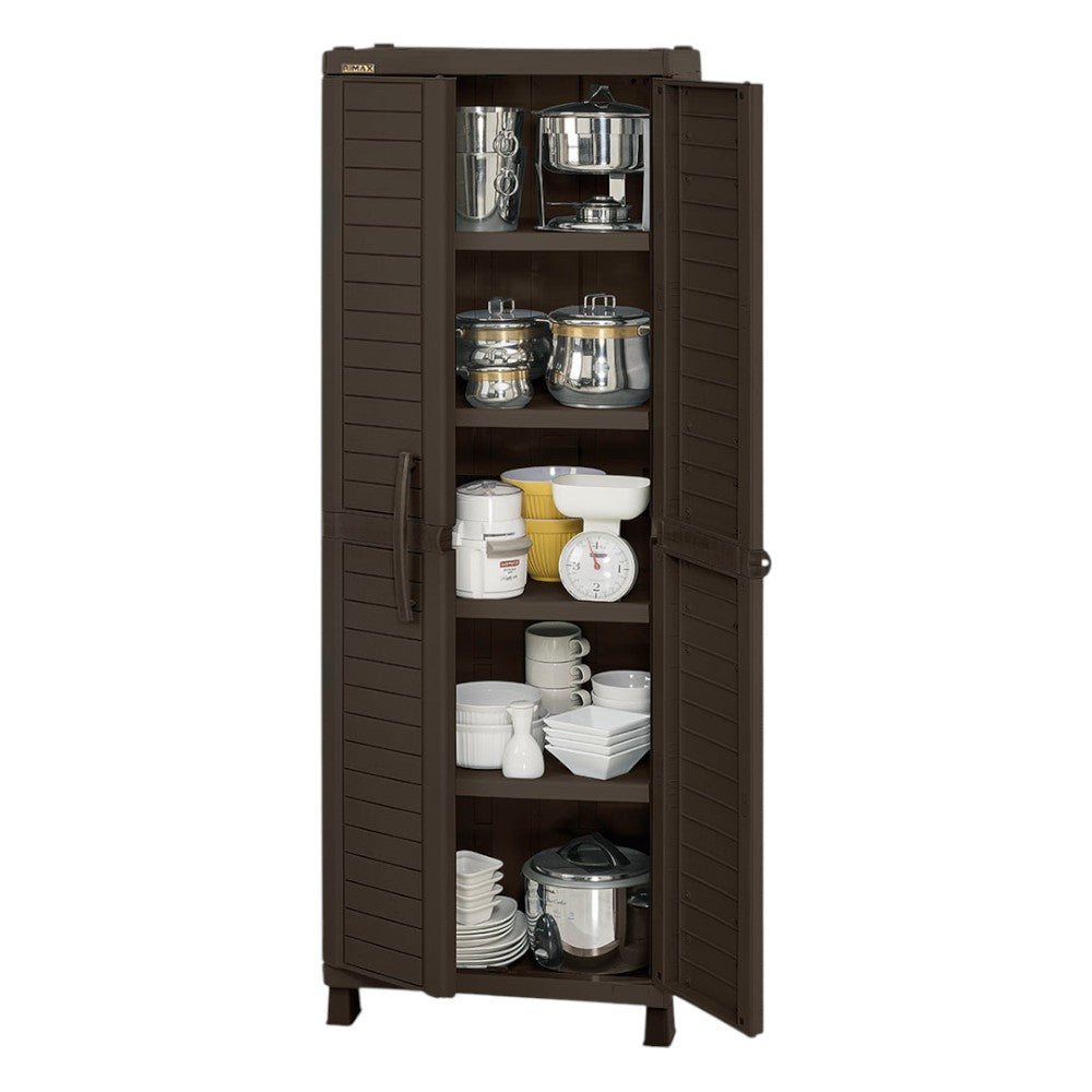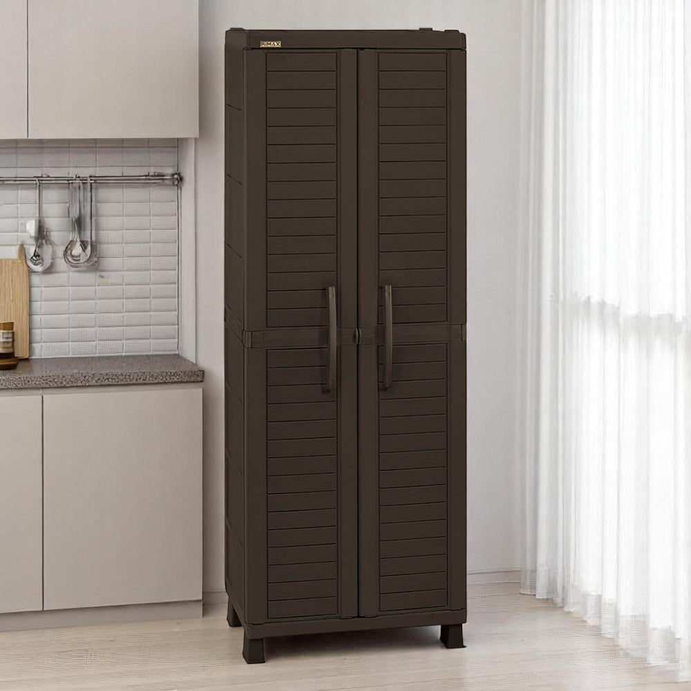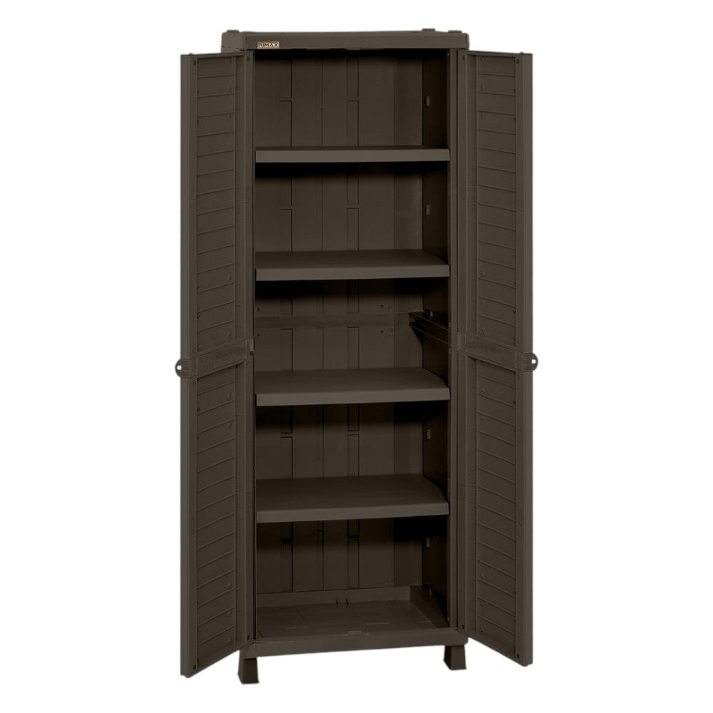 - ¿Buscas almacenamiento amplio, resistente y con estilo? El Armario Grande Barú de Rimax es la solución perfecta para organizar tu ropa, artículos del hogar o cualquier tipo de objetos. Su diseño elegante en color wengué y estructura de plástico reforzado lo hacen ideal para interiores y exteriores.