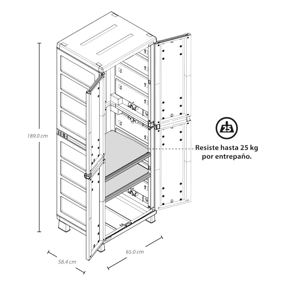 - Espacio multifuncional: Incluye 2 entrepaños ajustables de hasta 25 kg c/u, además de un tubo de aluminio para colgar ropa.