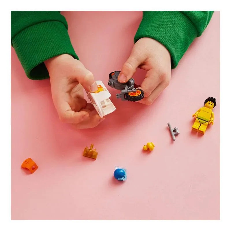 - ¡Simplemente agregue el personaje de LEGO City Stuntz, Sudsy Simon Tub Racer, completo con su pato de baño de juguete, snorkel y chaleco salvavidas para divertirse en un espectáculo de acrobacias en la bañera de alto vuelo!