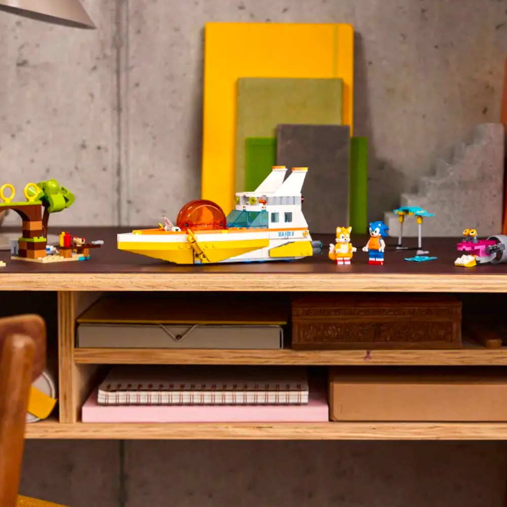 Este alucinante juguete de Sonic ofrece a los fans del Borrón Azul la oportunidad de crear un sinfín de historias con Sonic y Tails: desde organizar una fiesta en el barco con baile, karaoke, esquí acuático y paravelahasta relajarse en la isla después de derrotar a Jawz y rescatar a un Tocky.