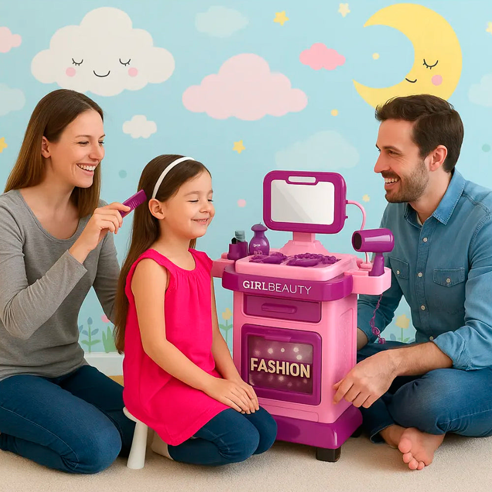 Un adorable tocador infantil en formato de carrito, ideal para pequeñas estrellas que aman jugar a la moda.