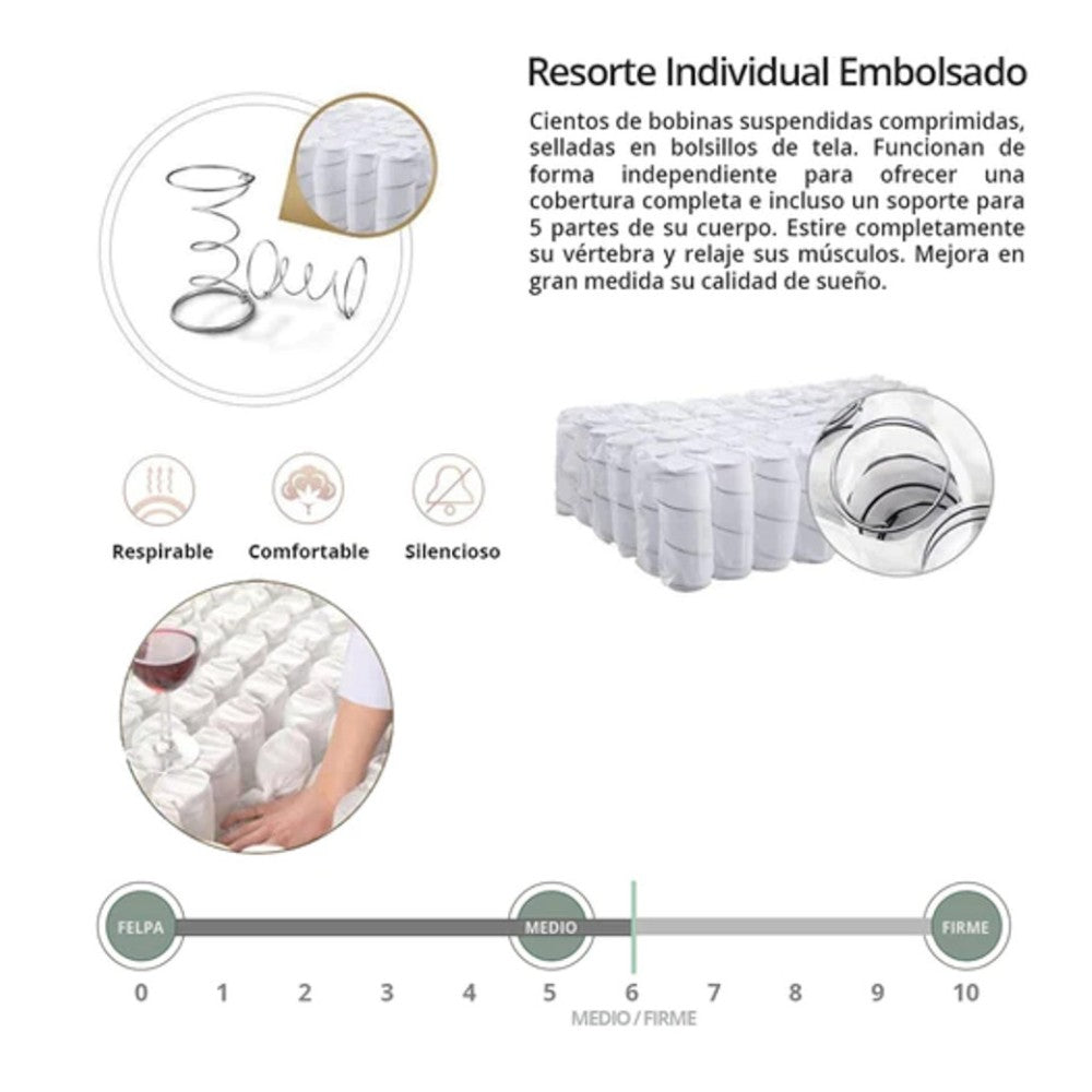 - Materiales: fibra poliéster, gel memory foam, algodón ecológico, resorte embolsados, espuma viscoelástica, espuma ortopédica enfundada, tejido de poliéster.