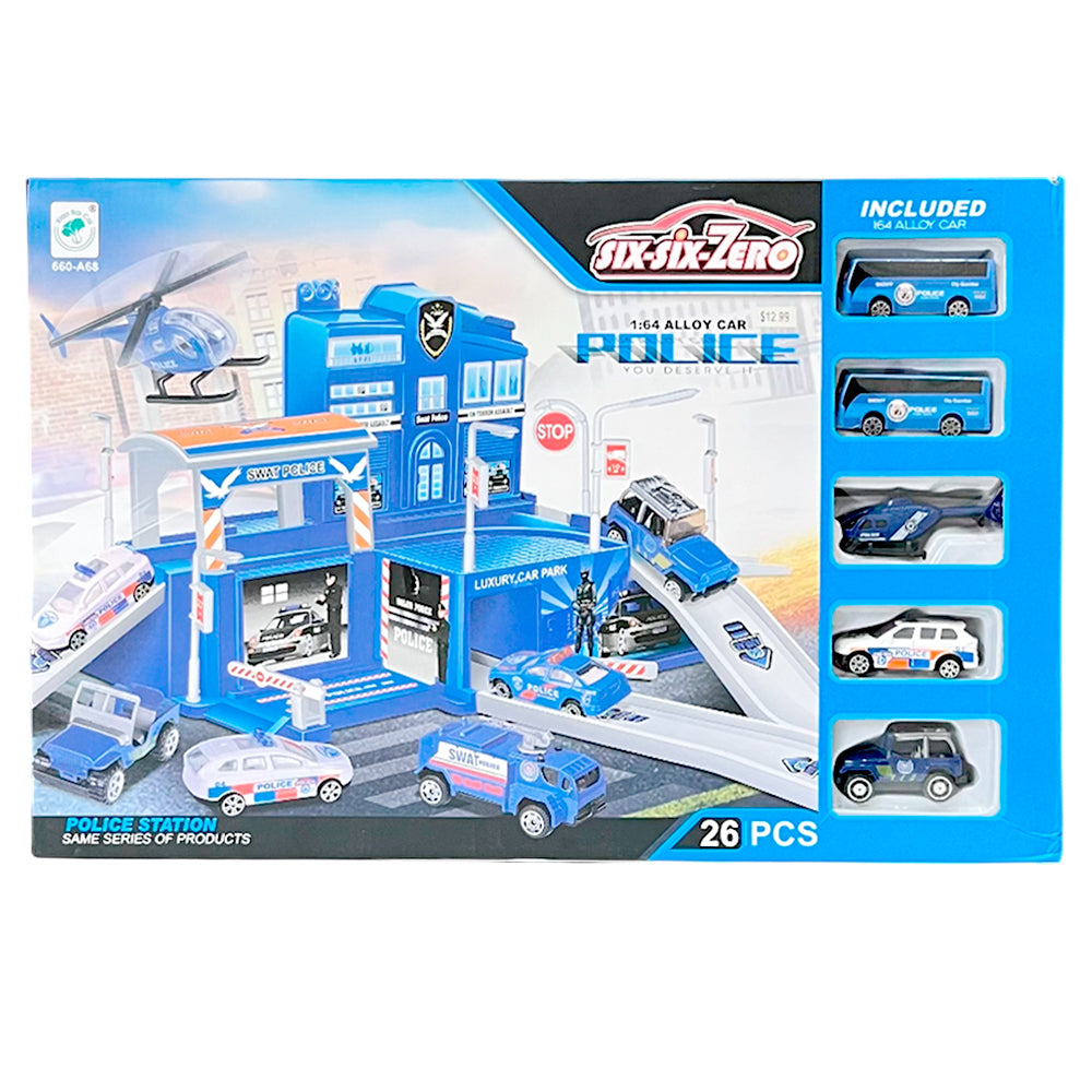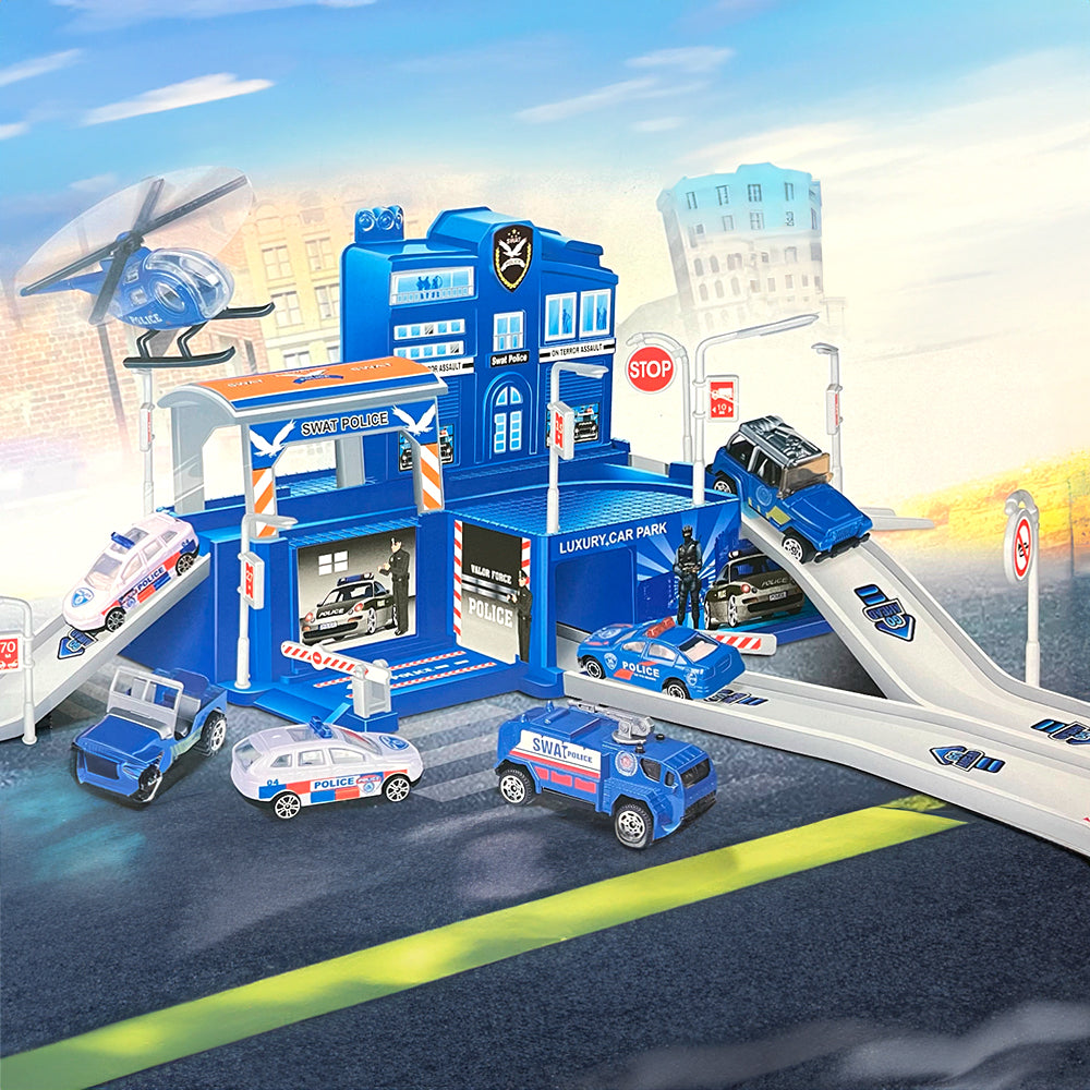 ¡Listos para la misión! Con este increíble estacionamiento policial, los niños podrán estacionar, patrullar y vivir emocionantes persecuciones con vehículos surtidos y escenarios llenos de acción.