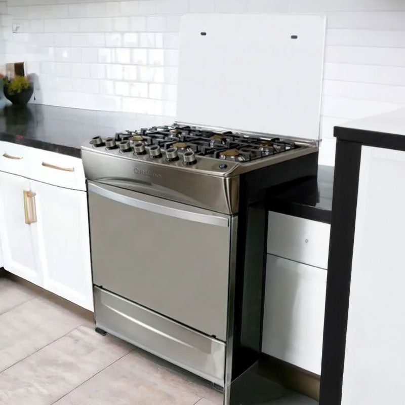 - Su tapa de vidrio protege tus quemadores cuando no están en uso y puede servir como superficie adicional para preparar tus ingredientes.