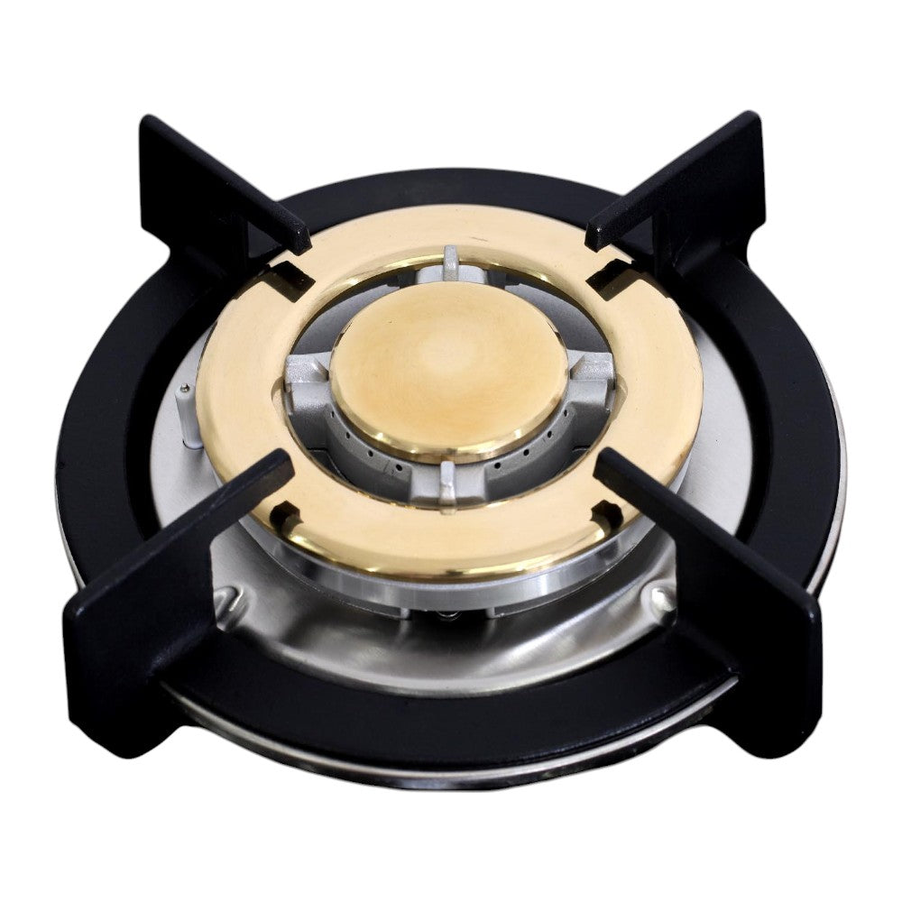 - Cubierta del quemador en latón, base de quemador en aluminio (1 extra grande, 1 grande, 2 medianos, 1 pequeño)