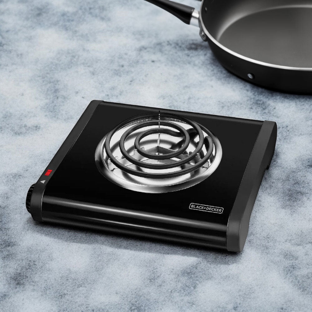 - Su diseño en elegante color negro le da un toque moderno, mientras que su único quemador es perfecto para preparar platillos rápidos o como complemento en espacios pequeños, oficinas o al acampar.