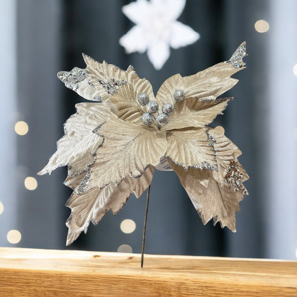 - Esta hermosa flor no solo captura la esencia de la Navidad, sino que su diseño natural y su acabado plateado escarchado aportan un brillo sutil y sofisticado a cualquier espacio.