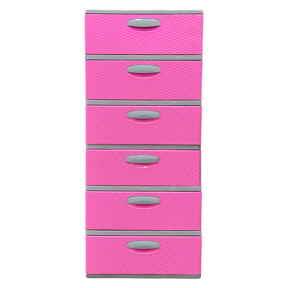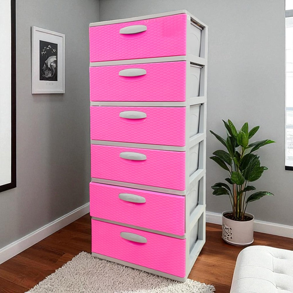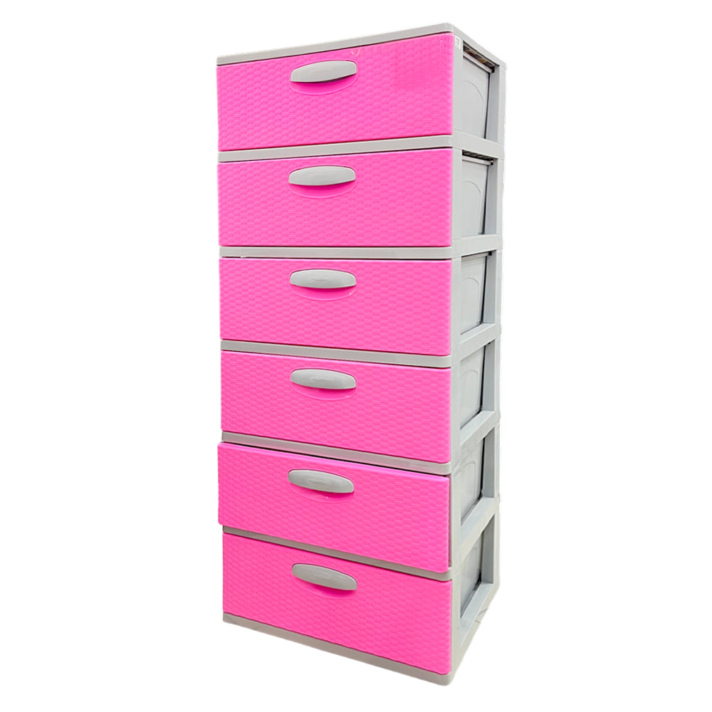- Color: Cuerpo gris claro con frentes de cajones en color rosado tipo textura ratán.