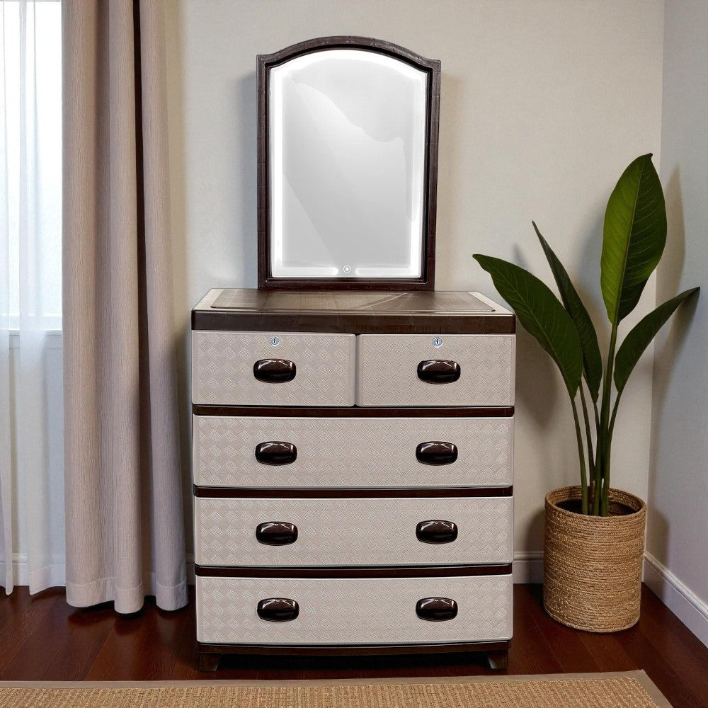El Gavetero Supremo Plastimás combina diseño moderno, resistencia y practicidad, convirtiéndose en una excelente solución de almacenaje para cualquier espacio del hogar. Su acabado en color cocoa aporta elegancia, mientras que el espejo LED integrado con 3 tonos de luz brinda un toque sofisticado y funcional para tu rutina diaria.