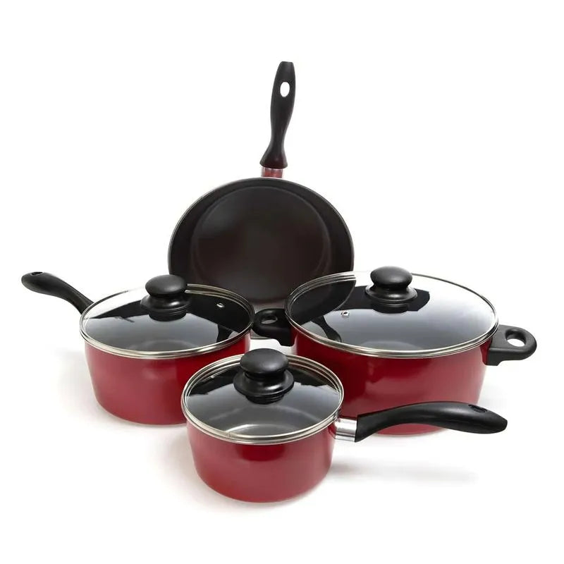 - Se trata de un set de tres ollas, con sus respectivas tapaderas, y un sartén de color rojo, con mangos y pomos negros. Estos utensilios están hechos de acero al carbón y vienen con tapaderas de vidrio.