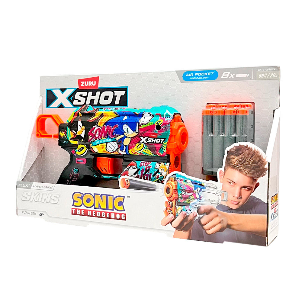 ¡Velocidad y diversión al estilo del erizo más famoso! El Lanzador Sonic X-Shot combina colores vibrantes, diseño único y funciones divertidas con 8 dardos para que cada batalla sea rápida y emocionante.