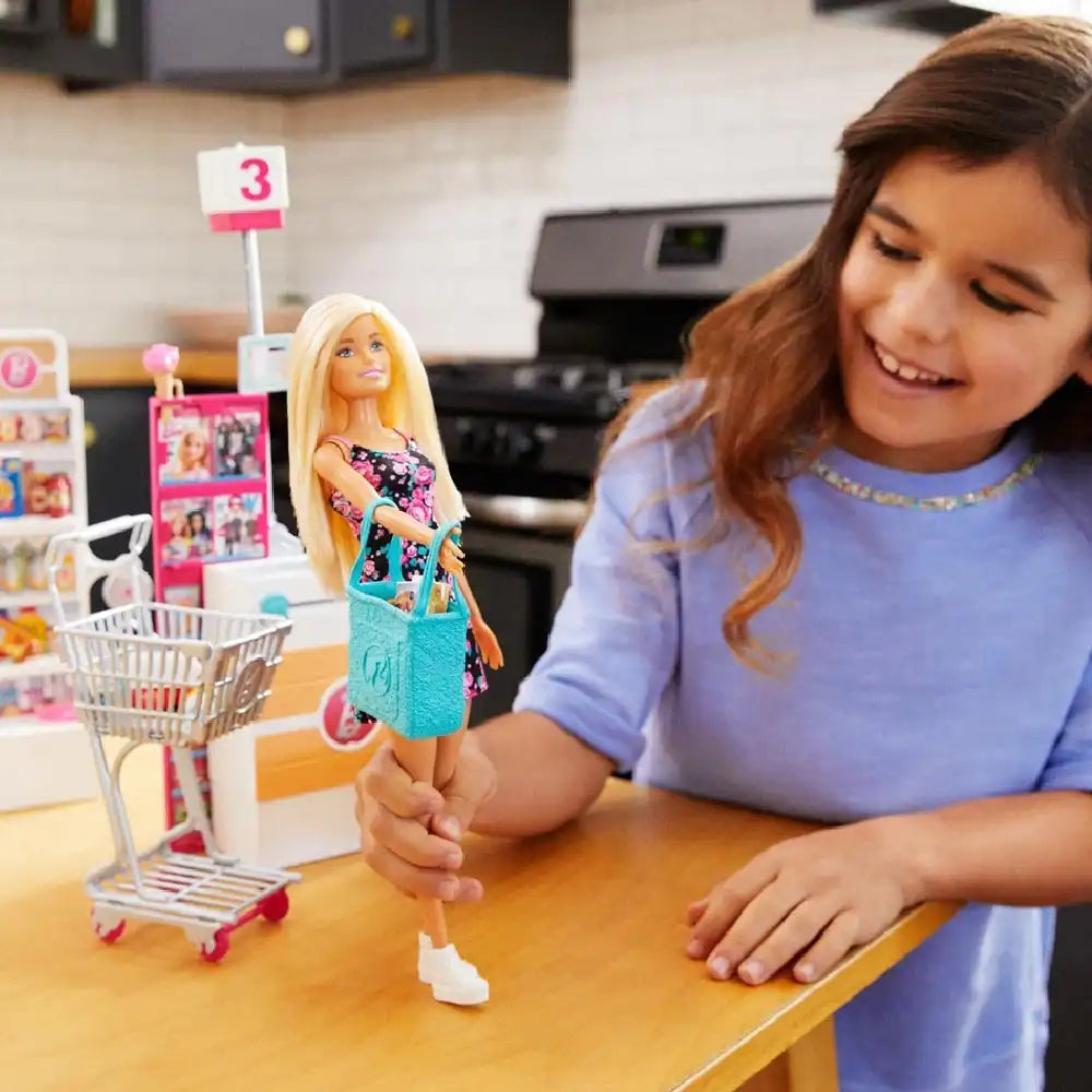 - Lleva a Barbie de compras con el set de súper mercado que tiene todos los ingredientes para la diversión, con más de 25 piezas en total: Barbie viene con un puesto de checado con caja registradora y banda que funciona, aparador, carrito con ruedas y accesorios de alimentos para colocar en los estantes