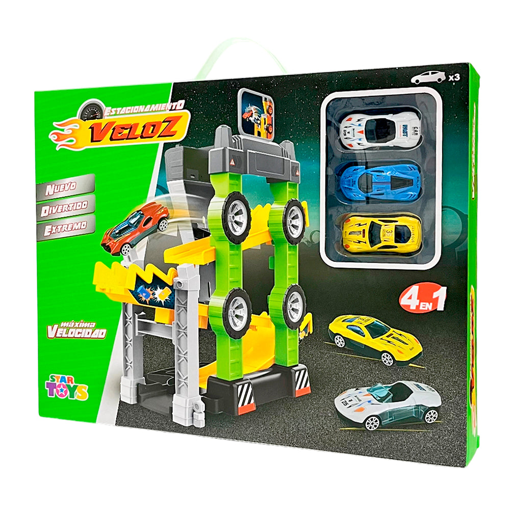 - Función 4 en 1: Incluye una pista de carreras, estacionamiento de múltiples niveles, zona de mantenimiento y área de lanzadores para autos.