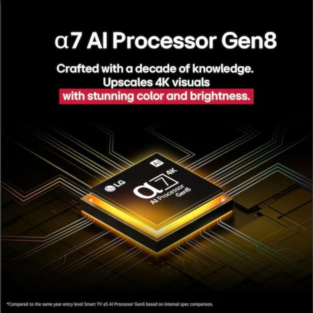 El Televisor LG 50" 4K combina potencia, calidad y diseño para ofrecerte una experiencia de entretenimiento inigualable. Con su procesador α7 AI 4K Gen8 y tecnología HDR10 Pro, cada escena cobra vida con colores vibrantes, contrastes equilibrados y un sonido envolvente que te sumerge por completo en la acción.
